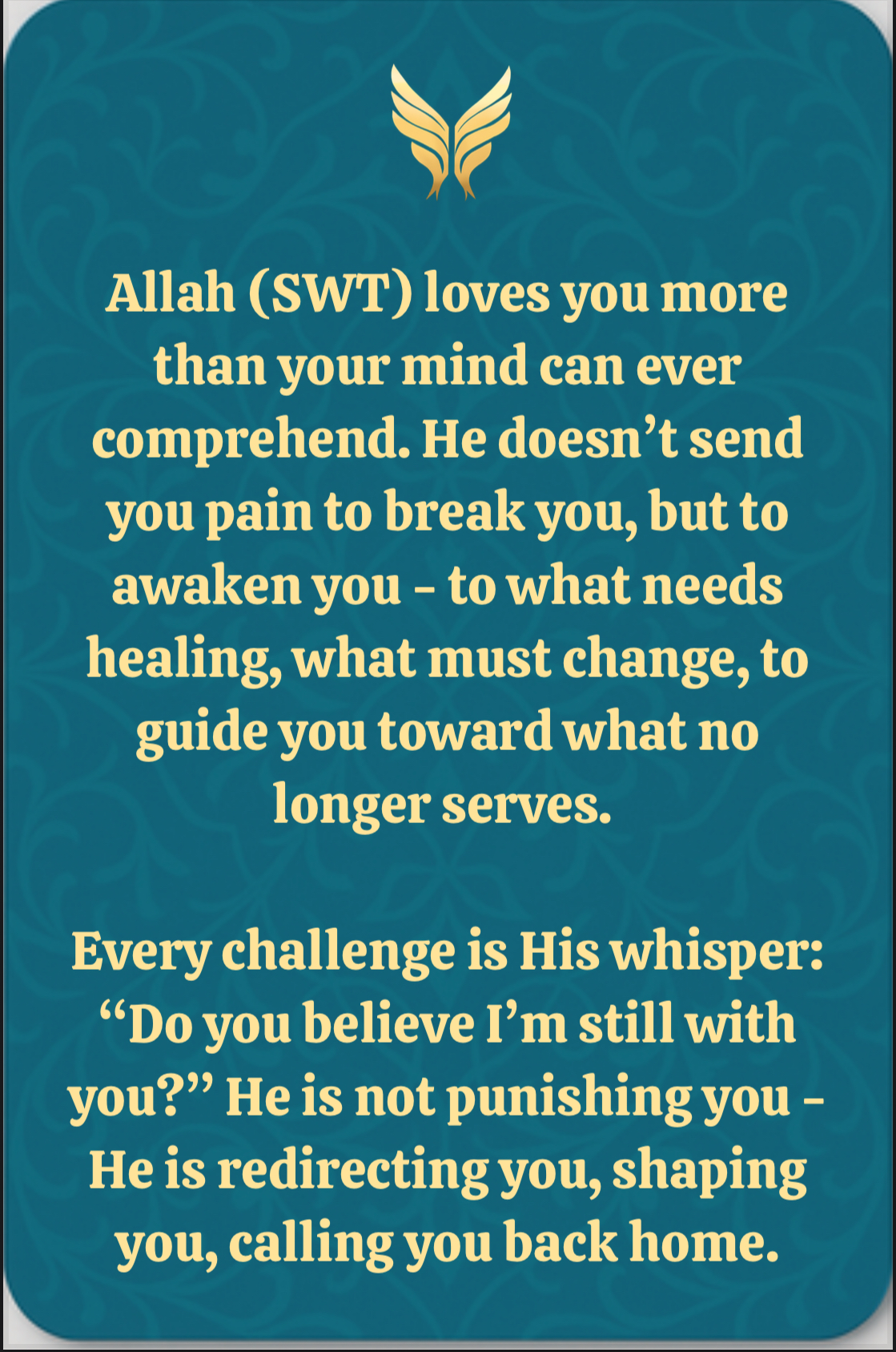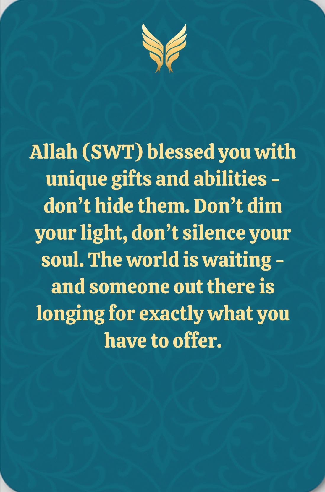 Each message is a gentle light in the dark, a reminder to return to your heart, reconnect with Allah (SWT), and take the next step with faith. These cards don’t just speak to your mind — they reach your soul.